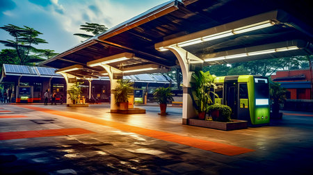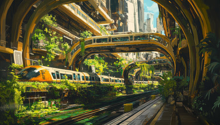 An eco-innovative transit hub roofed with a verdant canopy. This hub illustrates the concept of green transportation, merging advanced infrastructure with environmental stewardship to revolutionize public transit spaces.