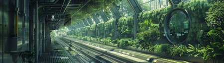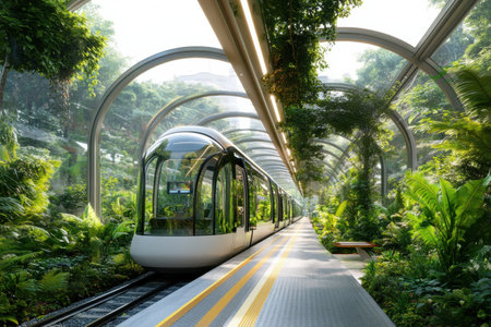 A modern train station features sleek design and renewable energy sources surrounded by vibrant greenery and plants. The bright tones create an inviting atmosphere for travelers.
