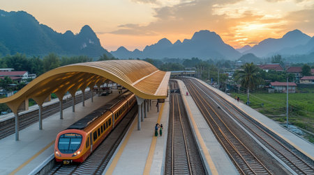 A picturesque railway platform at sunset, framed by majestic mountains and a vibrant sky. Capture the blend of architecture and natural beauty, ideal for travel enthusiasts.