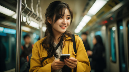 Photo of young Asian girl holding a phone in the subway explaining the importance of public transportation.