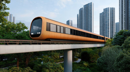 A modern wooden train glides along an elevated track amidst lush greenery and urban skyscrapers, showcasing innovative design and integration with nature.
