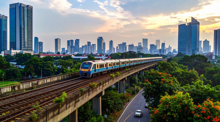 jakarta Metro Train (BTS) with cityscape background at sunset.