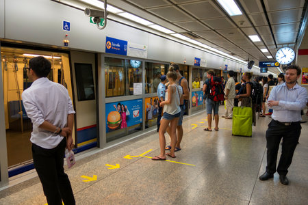 BANGKOK : Passengers on a Metropolitan Rapid Transit (MRT) subway train on 26 february 2015 in Bangkok. Thailand. The MRT serves 240,000 people daily with 18 stations and 27 km of track.