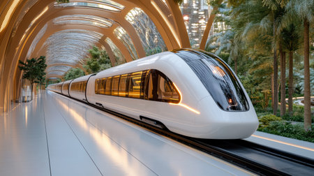 A zero-emission maglev train silently glides through a lush forest, embodying eco-friendly travel with its sleek design and advanced green technology, minimizing disruption to nature.
