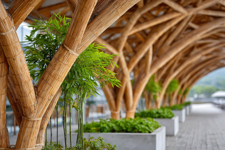 Bamboo structure creating an architectural design with green plants in concrete planters