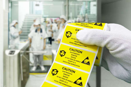 Hand holding ESD symbol label with antistatic gloves, Electrostatic Sensitive Devices (ESD) in electronic industrial.