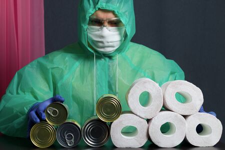 A man in a medical mask, glasses, rubber gloves and a raincoat. Folds toilet rolls and tin cans on the table. Stocks for the time of the epidemic.