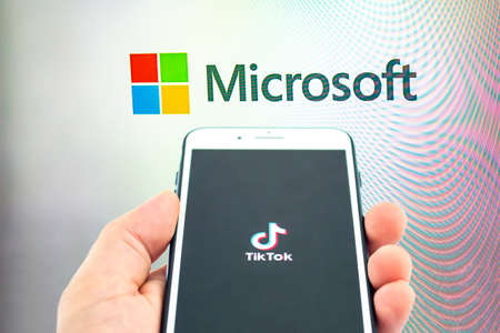 Calgary, Alberta, Canada. Aug 6, 2020. A person holding an iPhone 8 Plus with the Tiktok logo on a monitor with the Microsoft logo. Concept Microsoft buying Tiktok.