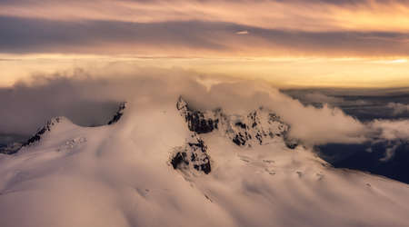 Aerial View from Airplane of Canadian Mountain Landscape in Spring time. Colorful Sunset Sky Art Render North of Vancouver, British Columbia, Canada.