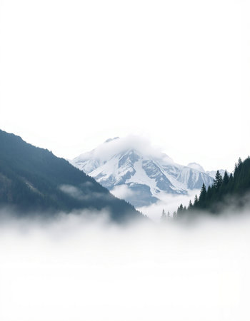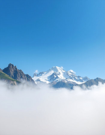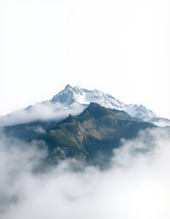 Mountain landscape with snow-capped peaks in the clouds.