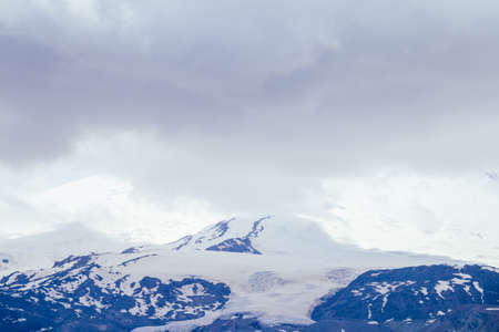 Mountain landscape with snow covered peaks in the clouds at sunrise.