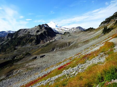 Snowy Mount Baker view and autumn colored slope
