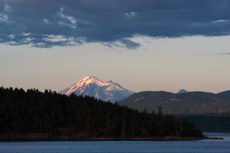 Mount Baker, the 4th highest mountain in Washington State, on at sunset on a mid-august evening. It is high enough that the sun still shines on it for a little while after sunset, giving it this reddish glow in the twilight.