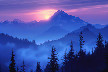 Foggy mountain landscape with coniferous forest and high peaks