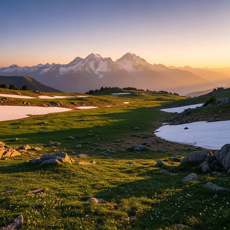 Alpine landscape with snow-capped mountains and meadows, Switzerland
