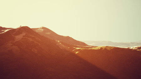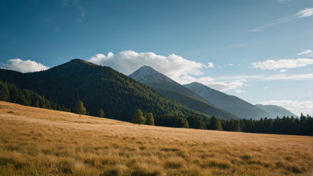 A breathtaking mountain landscape featuring rolling hills bathed in soft sunlight, showcasing the tranquil beauty of nature's diverse shapes and textures. Perfect for outdoor enthusiasts.