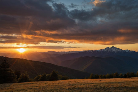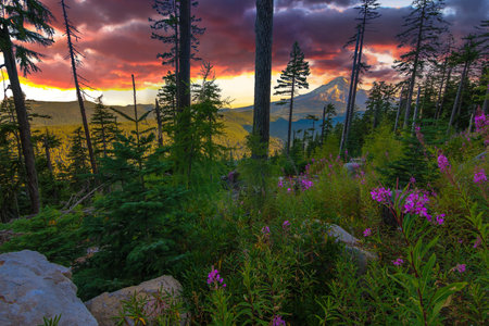 Majestic View of Mt. Hood on a bright, colorful sunset during the summer months.