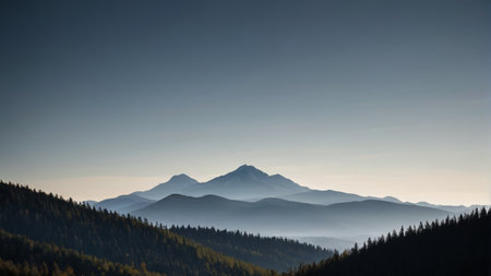 Distant mountain peak over forested hills during sunset