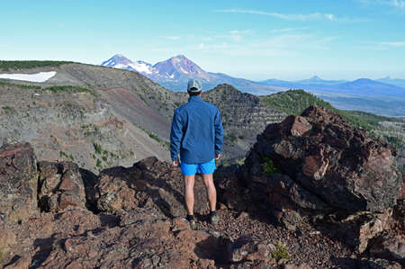 Young male trail runner enjoys view of Three Sisters volcanoes at end of Tam McArthur Trail in Three Sisters Wilderness, Oregon.