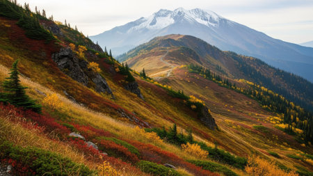 Snowy Mount Baker view and autumn colored slope