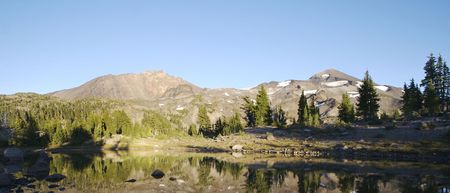 Summer Sunrise South Sister Mountains in Central Oregon near Bend are reflected in Green Lakes. Oregon, USA Beautiful landscape background