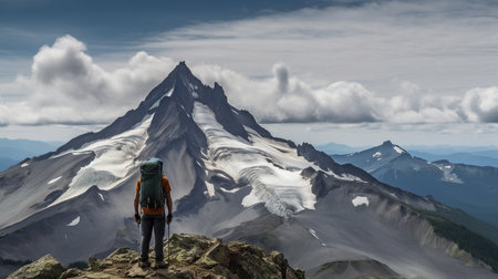 A hiker is standing on the mountain with clouds during sunset/sunrise at Mount Rainier National Park, Washington.
