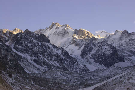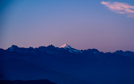 Beautiful last light from sunset on Mount Kanchenjugha, Himalayan mountain range, Sikkim, India. color tint on the mountains at dusk