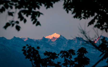 Beautiful last light from setting sun on Mount Kanchenjugha, Himalayan mountain range, Sikkim, India. color tint on the mountains at dusk. Tourist destination for viewing Himalayan mountain range.