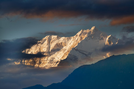 Dramatic last light from setting sun on Mount Kanchenjugha, Himalayan mountain range, Sikkim, India. color tint on the mountains at dusk. Tourist destination for viewing Himalayan mountain range.