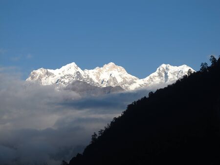 Mount kangchenjunga peak of Himalayan mountains at dawn. Snow clad white peaks under cloud cover as seen fro kalimpong india.