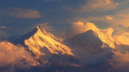 Experience the breathtaking beauty of snow-capped mountains bathed in the golden light of sunrise, surrounded by dramatic clouds and a vibrant sky.