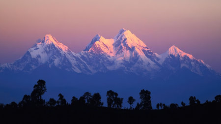 The stunning silhouette of Panchachuli peaks at dusk, framed against a colorful horizon with space for text or branding