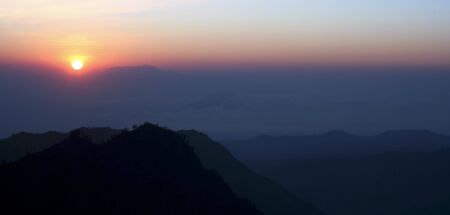 Dark photo of sunrise in mountains with clouds and sun rays on Java Island in Indonesia