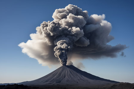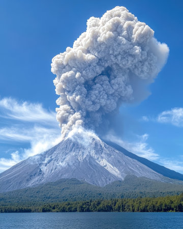 A vibrant volcano erupts vigorously, sending ash clouds spiraling into the blue sky above a tranquil lake, showcasing nature's power.