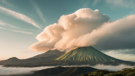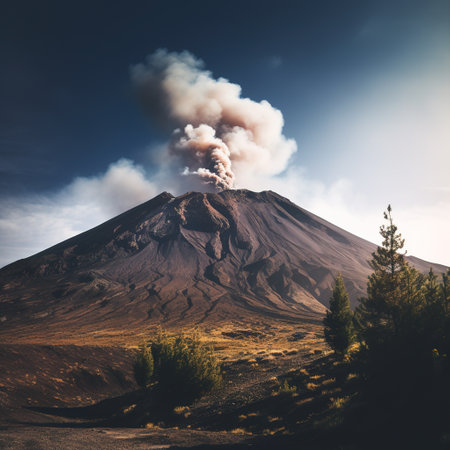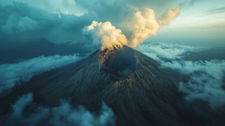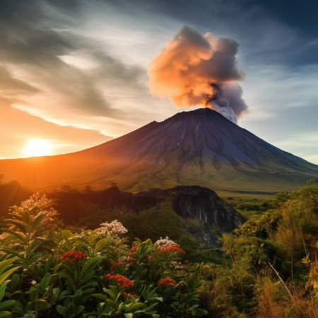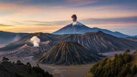 An active volcano spews smoke and ash into the atmosphere, set against a mountainous landscape and a colorful, cloudy sky. The composition emphasizes natural beauty, featuring a combination of textures and tones. It may be suitable for travel, environmental, or scenic themes for a variety of media.
