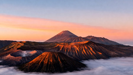 Volcanoes in Bromo Tengger Semeru National Park at sunset Java, Indonesia