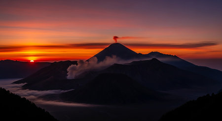 Start your day with an awe-inspiring sunrise over a majestic volcano.