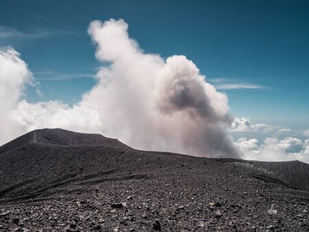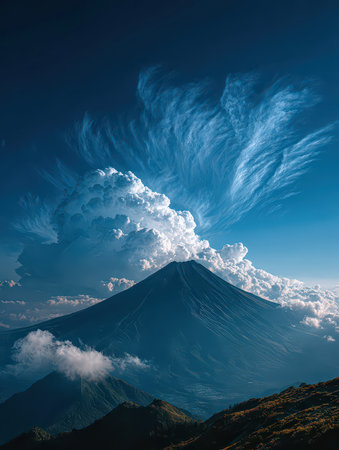 A stunning view of an active volcano against a vivid blue sky, showcasing dramatic clouds and an impressive landscape. Perfect for nature enthusiasts.