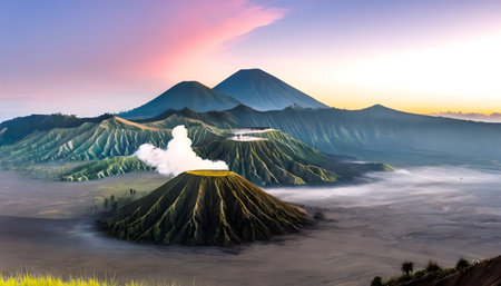 Panoramic view of Mt. Bromo at sunrise, Java, Indonesia
