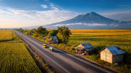 A long road stretches into the distance, passing by rustic buildings and fields of yellow crops. The image showcases a vibrant landscape under a bright, clear sky, with a large mountain in the background. This outdoor scene could be used for travel, nature, or lifestyle projects, suitable for a range of commercial applications.