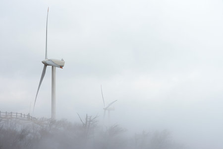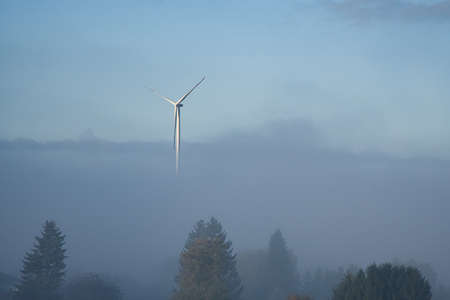 Windmill in foggy landscape. Renewable energy for environmentally conscious future. Power generation that is important for climate change.