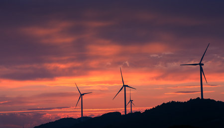Silhouettes of some wind mills on the top of a mountain during a super orange sunset with copy space peaceful