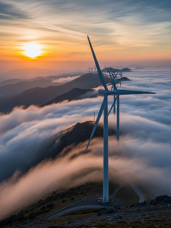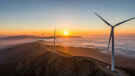 Wind turbines generating electricity on the top of the mountain at sunrise.