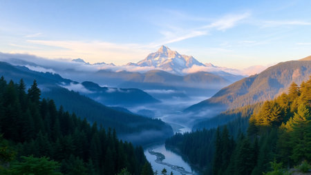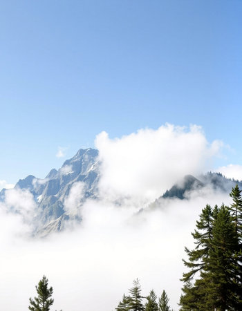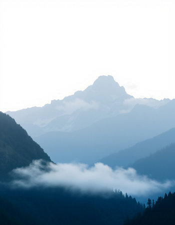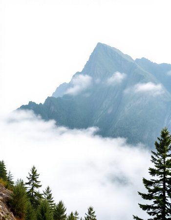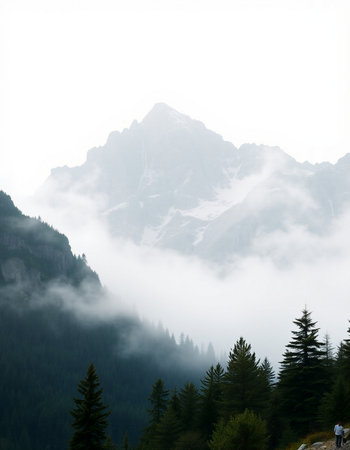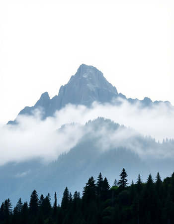 A Majestic mountain peaks rise above misty landscape, surrounded by evergreen trees and hints of autumn foliage. scene evokes sense of tranquility and awe