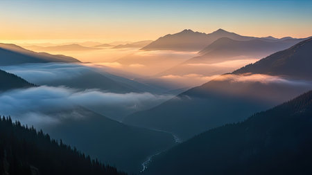 The sun rises softly behind a majestic mountain, casting a warm glow over the misty valleys. Layers of blue and orange hues blend in the sky, creating a tranquil atmosphere in nature.
