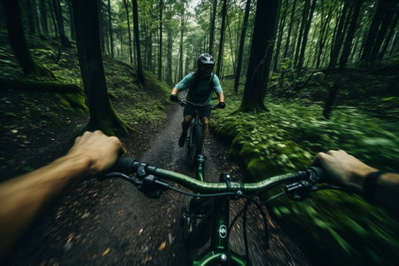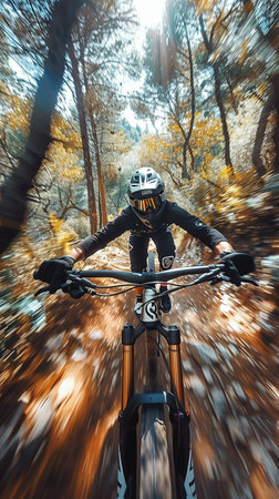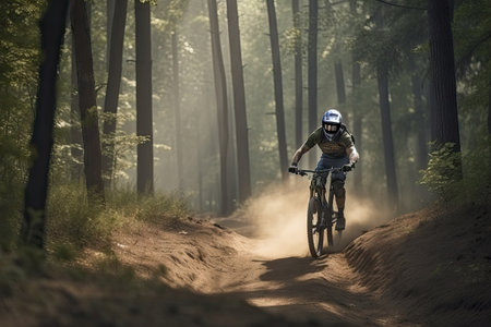 Mountain biker speeding down a trail in the forest, experiencing the thrill of the ride