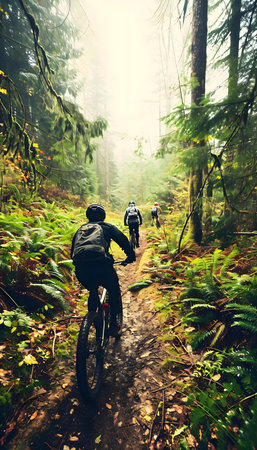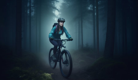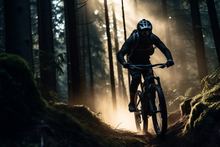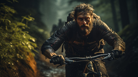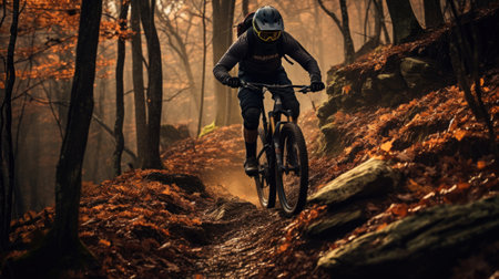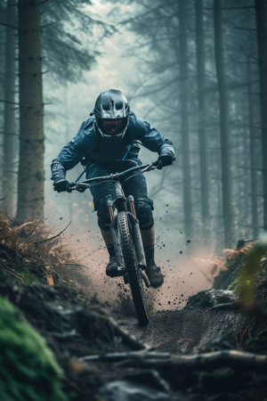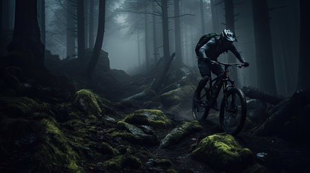 Mountain biker in action, speeding down a misty forest trail with focus and determination