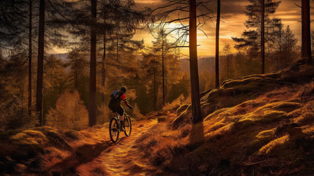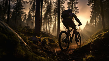 Mountain biker on forest trail in the sunset. Generative AI illustration