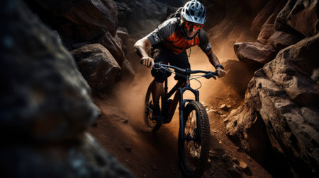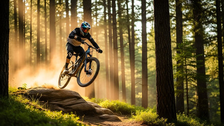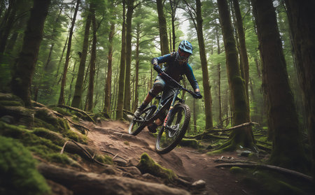 Enthusiastic cyclist navigating rugged terrain and lush forest on a thrilling mountain bike adventure capturing the spirit of and athletic accomplishment