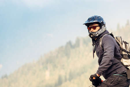 Mountain bike rider in sport equipment and helmet riding on rugged trails
